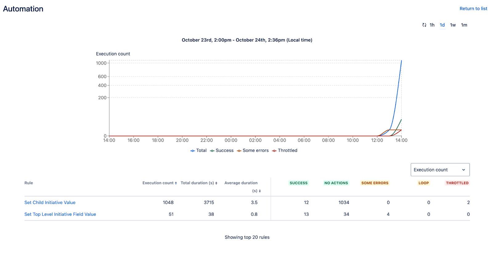 - Scalability: For medium-to-large organisations, the number of automation rule executions can quickly exceed Jira Premium’s 1,000 runs per user per month limit, making it unviable for high-frequency updates (see screenshot).