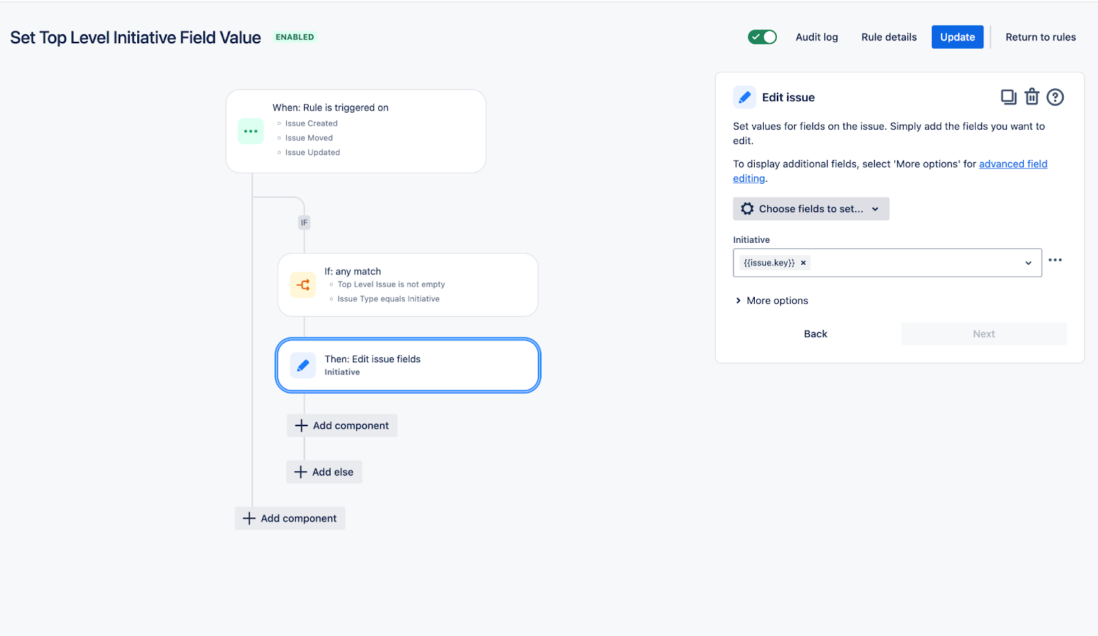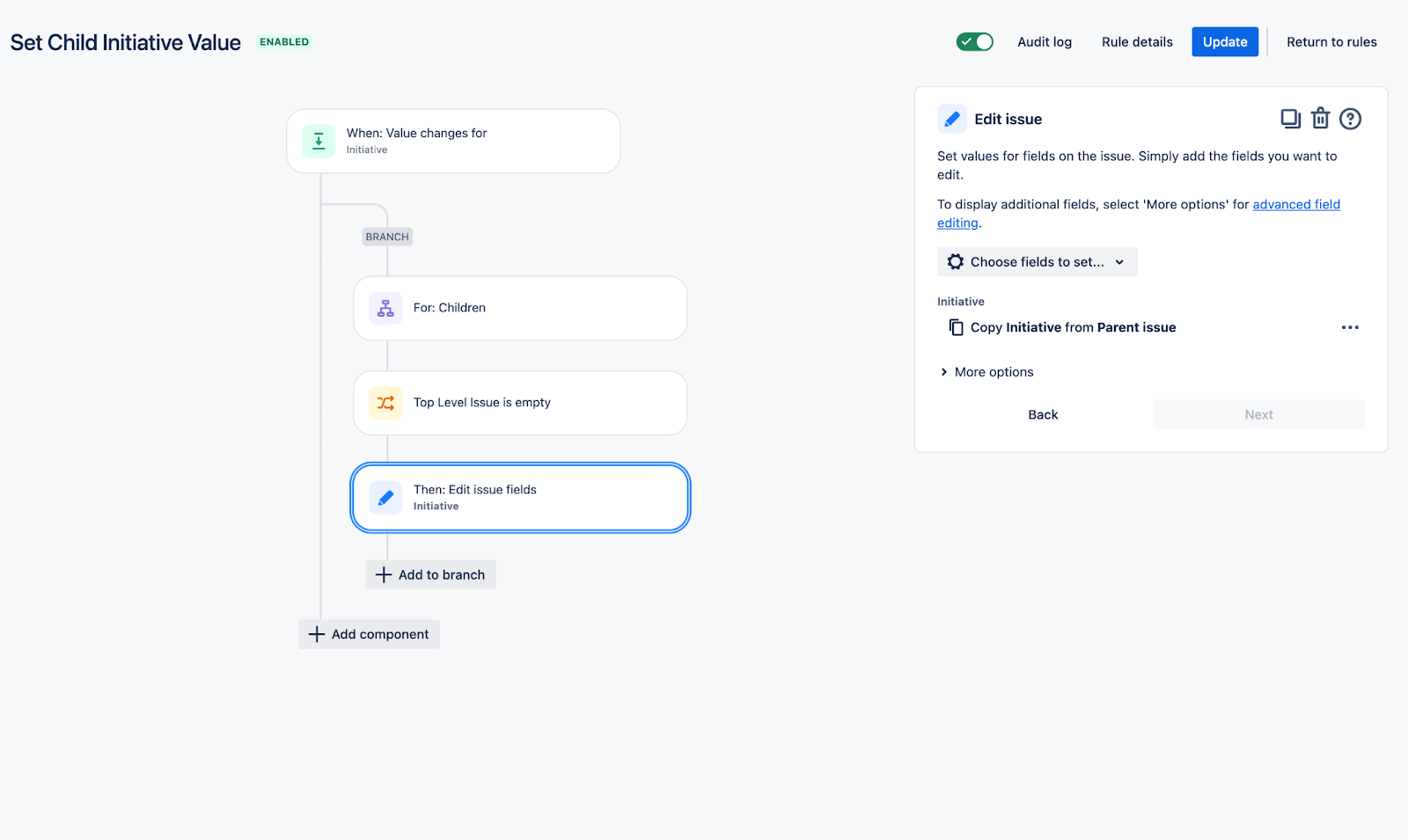 Jira Automation can also propagate information through a hierarchy, enabling top-level data like labels or fields to be copied to child issues.