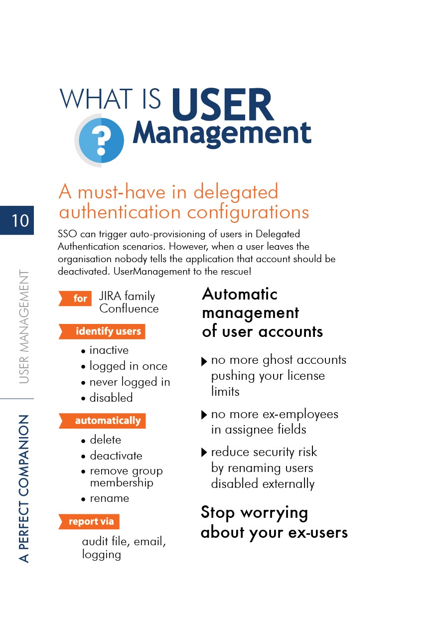 User Management is a must-have add-on for scenarios with delegated authentication. For example, EasySSO can trigger auto-provisioning of users when the backend user directory is configured to perform delegated authentication. However, when a user leaves the organisation nobody tells the application that that account should be deactivated. Thus, User Management by TechTime was born.