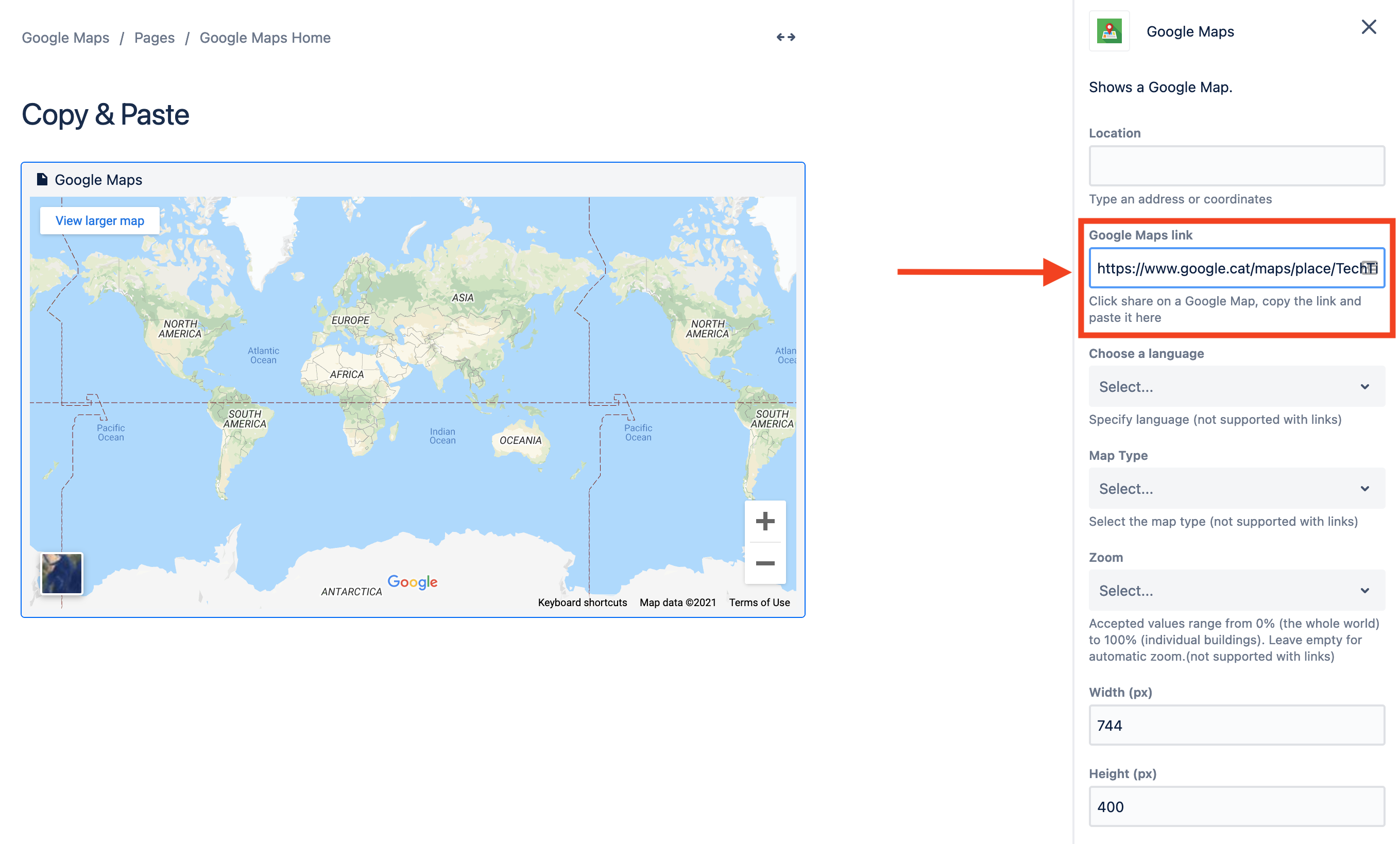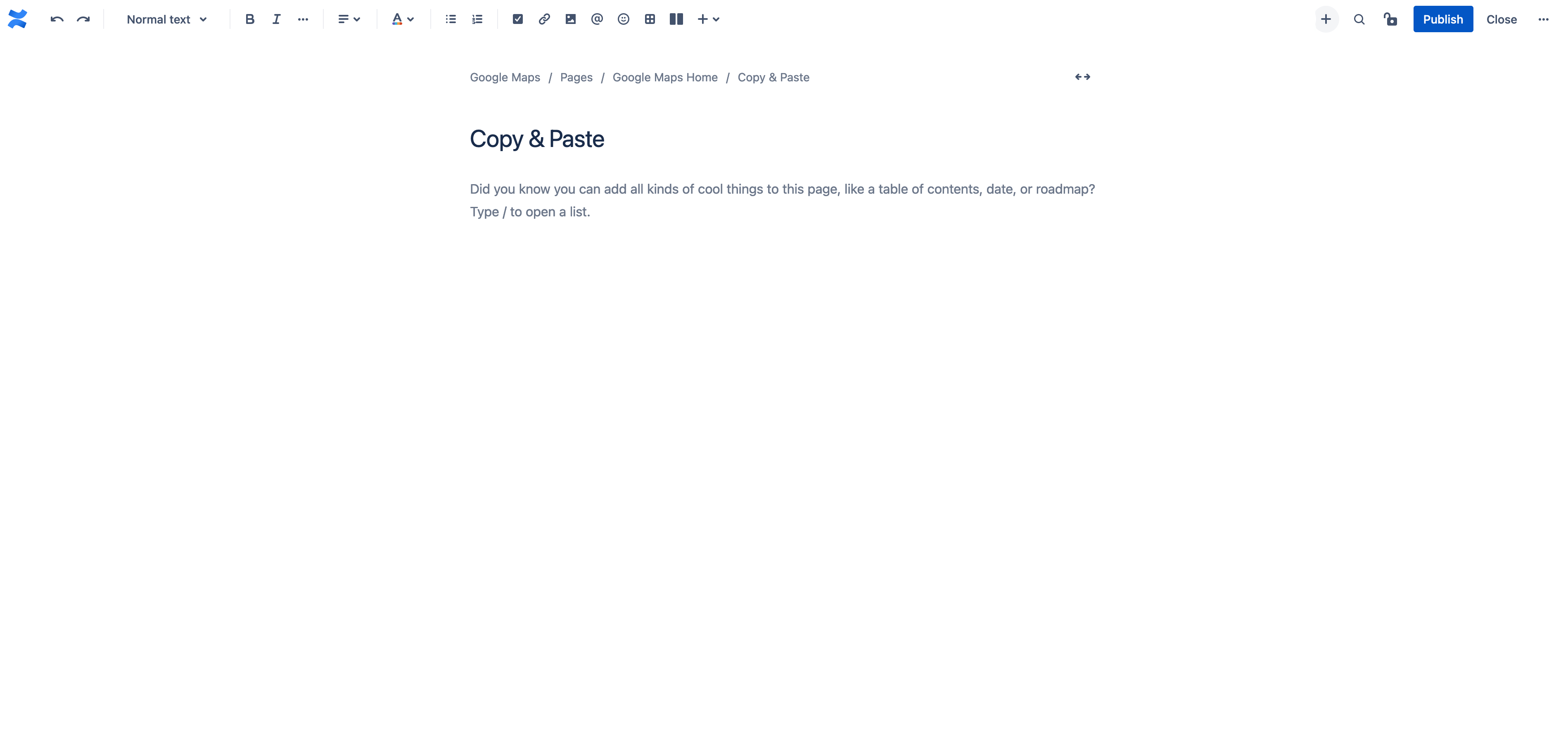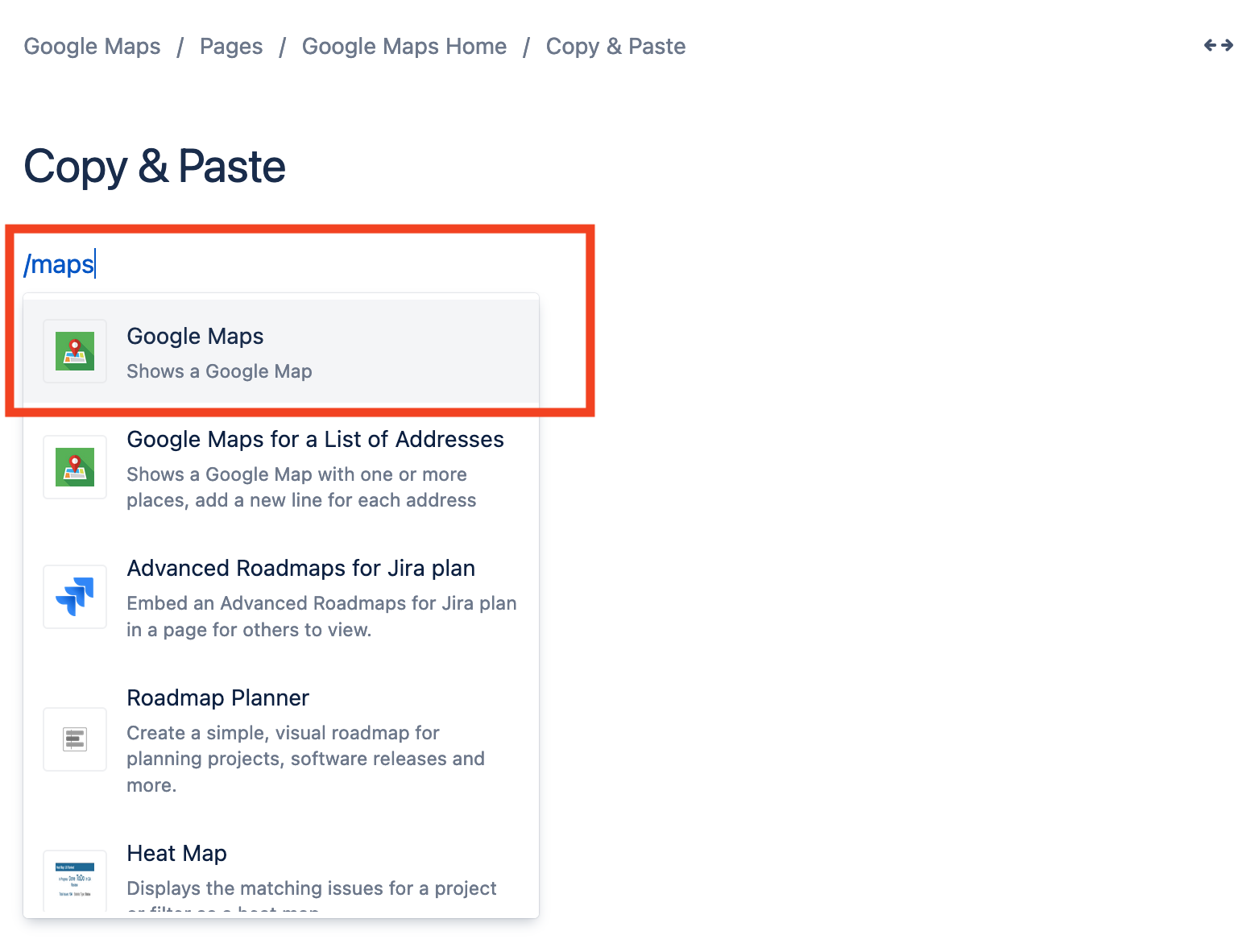 Maps can be inserted into your Confluence pages by copy and pasting a Google Maps share link into the Confluence page editor. Want to insert a URL straight from the address bar? You can!