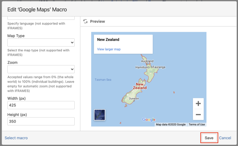 When inserting a map into your Confluence page by address, coordinates, or a search term you can specify visualisation parameters