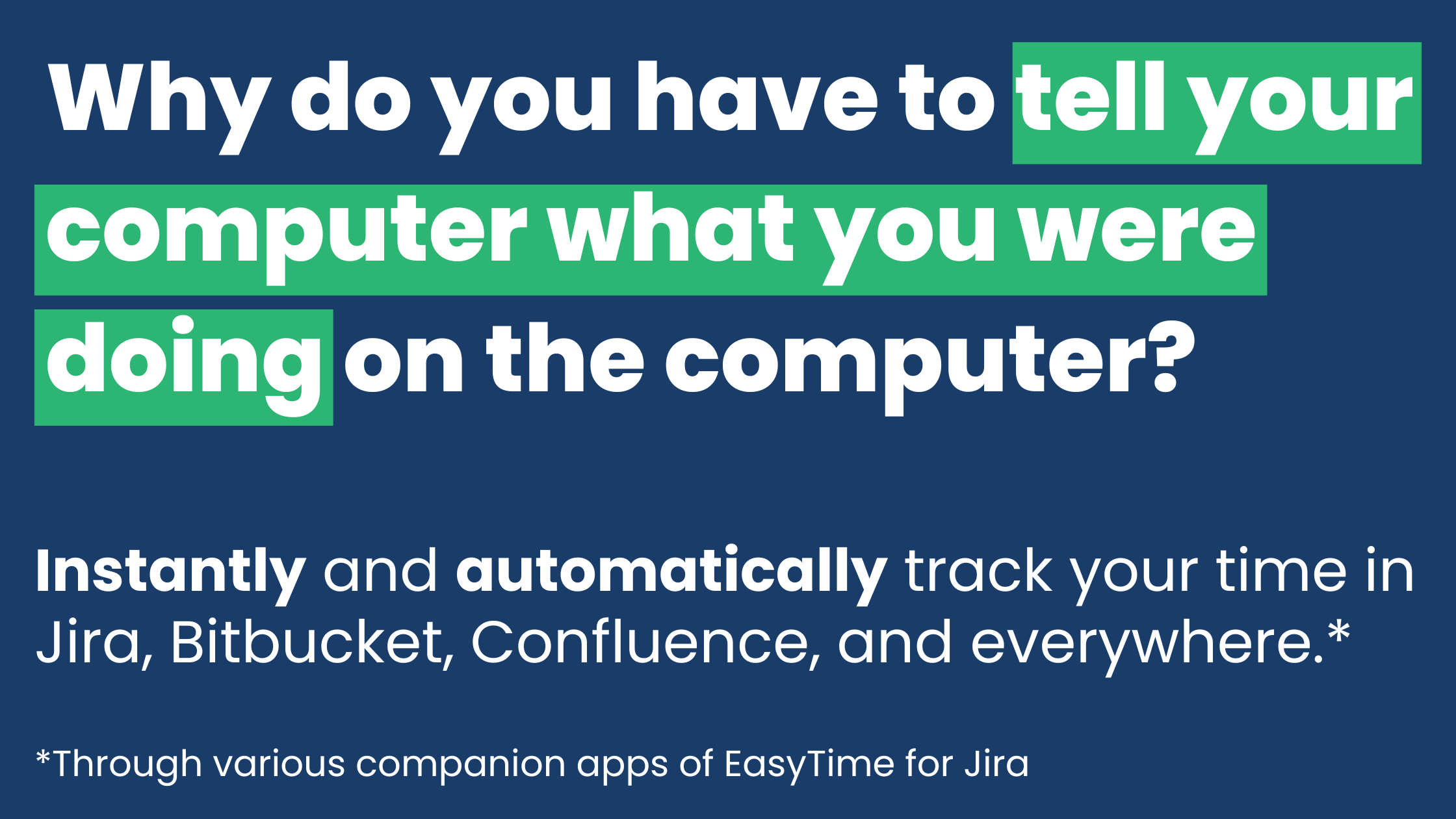 Although I spend part of my day checking my board and looking at issues in Jira and reviewing pull requests in Bitbucket, I spend most of my day in other tools where I actually code, test, and debug the products that we make. I am fortunate to work in a team where I get to work with a huge variety of tools and platforms. I enjoy the breadth of work that I get to do, but unfortunately this means that EasyTime for Jira and Bitbucket is only able to capture a small part of my work as a full stack developer. We don't think an effective time tracking tool should force you to change your behaviour. This is why I was thrilled to hear that we have started to expand beyond Atlassian's tools to make sure all of our teams' time is being recorded automatically.